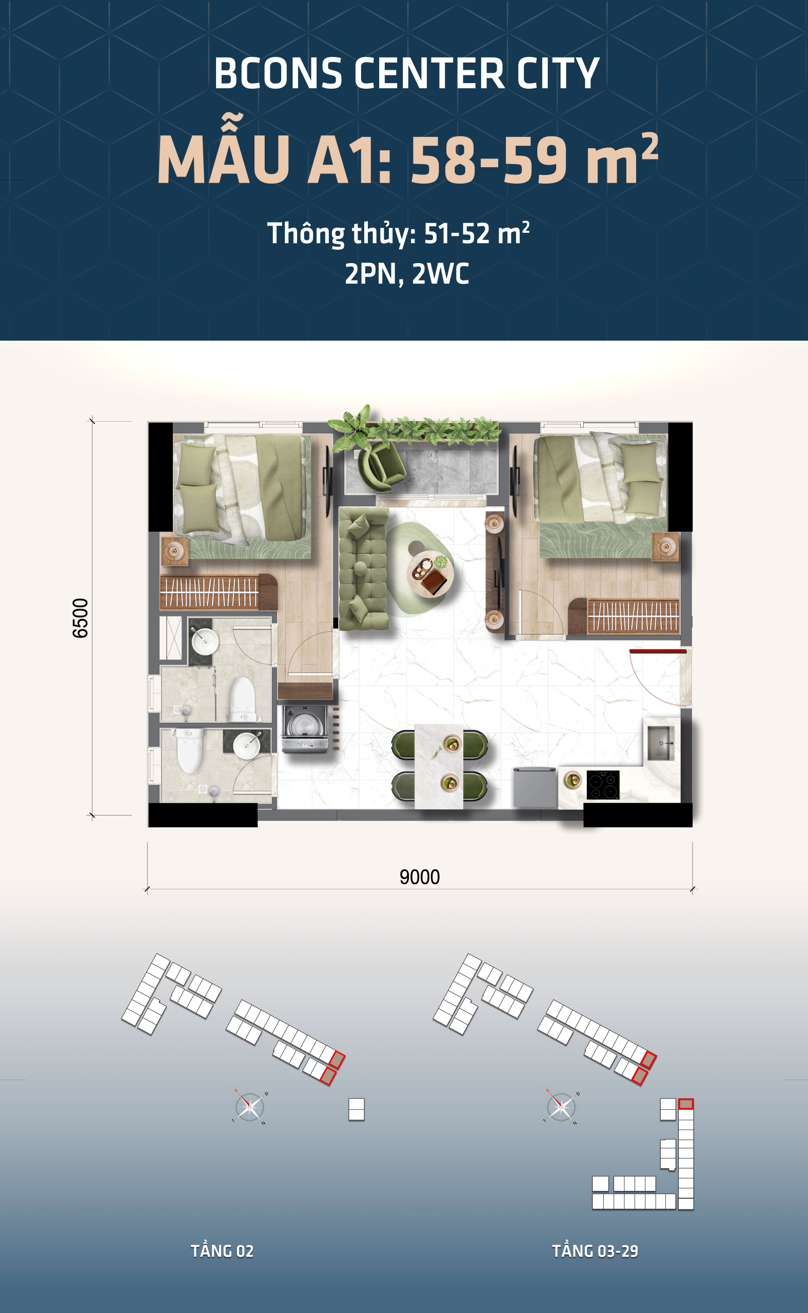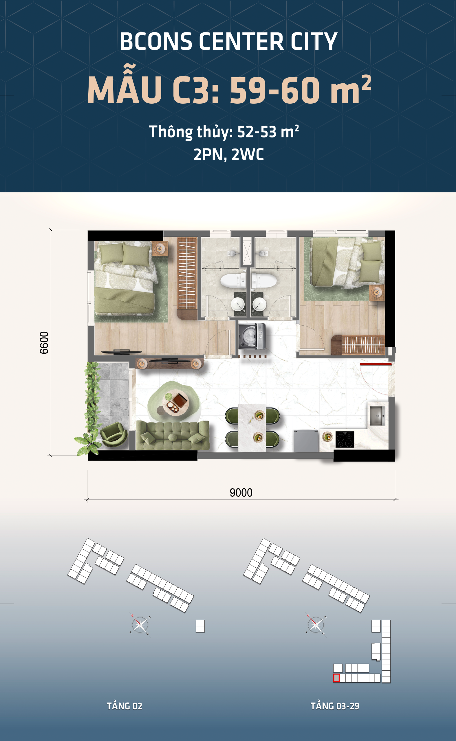 2PN - 2WC2,900,000,000 VNĐ - 3,000,000,000 VNĐ52,48 - 55,77m2