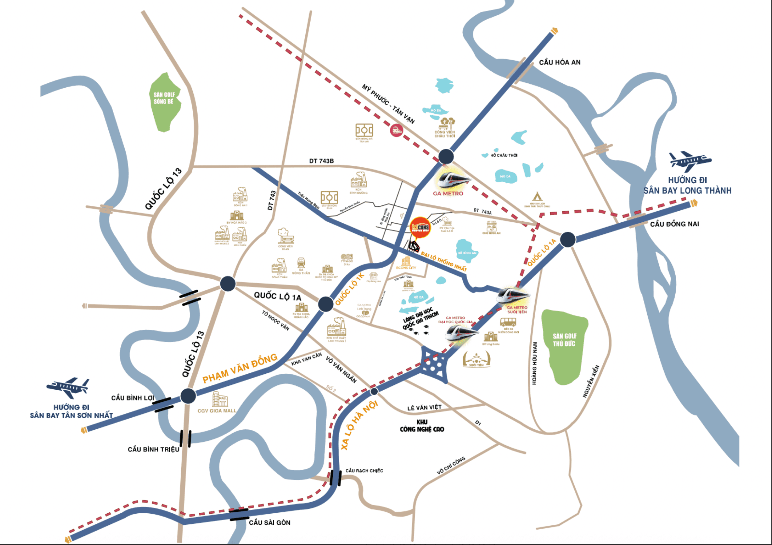 Bcons Center City là khu phức hợp nhà phố căn hộ cao cấp nhất của chủ đầu tư Bcons tại đường D11 kết nối liền kề đường Thống Nhất – Tuyến đường sầm uất nhất Dĩ An, liền kề Thành phố Thủ Đức. Bcons Center City sở hữu nhiều điểm cộng trong việc liên kết thông qua nhiều công trình giao thông trọng điểm: Bến Xe Miền Đông, Tuyến Metro Suối Tiên, Làng Đại Học, Trung tâm thương mại lớn nhất Dĩ An.
